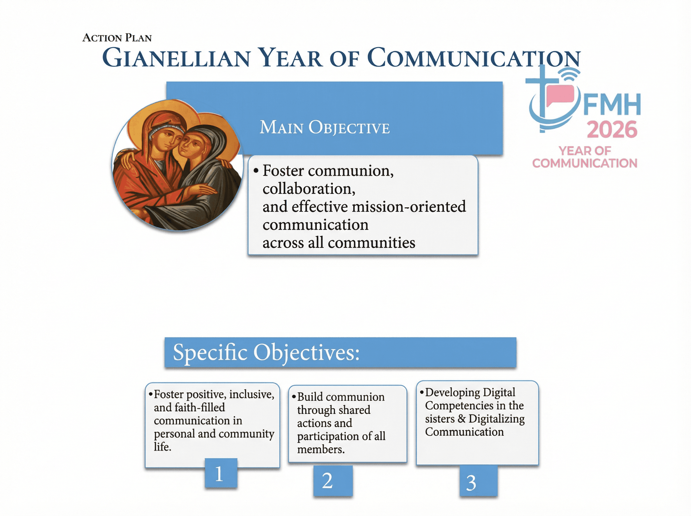 “Attentive to the needs of the times, in creative fidelity to the founding Charism, Vigilant Evangelical Charity, we do our best for the good of all persons, with a special love for the poor. Our service of charity within the Church is expressed in self-giving and selflessness: “oblivious of personal interest or comfort, and even of ourselves.” In sisterly communion, we joyfully take up the challenge of becoming everything to everyone, with a commitment, which knows no limit other than the impossible or the inopportune” (C.3).